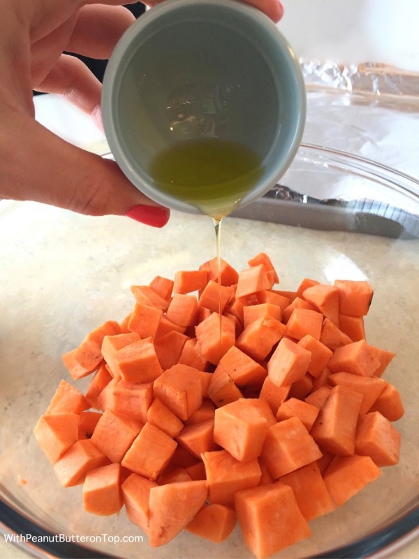 - Peel and chop sweet potatoes into 1/2 inch cubes.