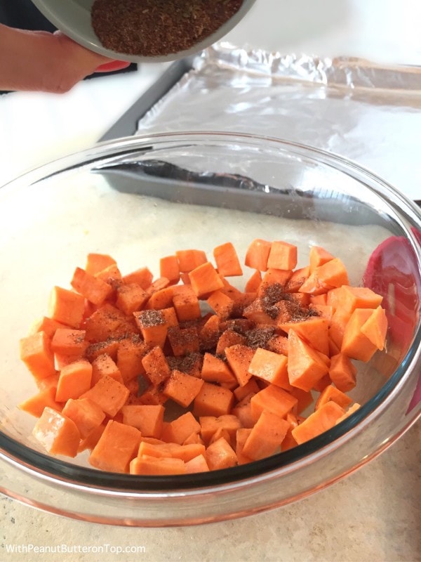 - Combine all seasonings into a small bowl and the sweet potato into a medium mixing bowl. Mix sweet potatoes with olive oil, tossing to coat.