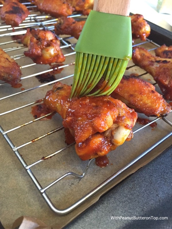 Once the wings are coated in the sauce, place them back onto the prepared baking sheets, making sure to space them evenly apart.