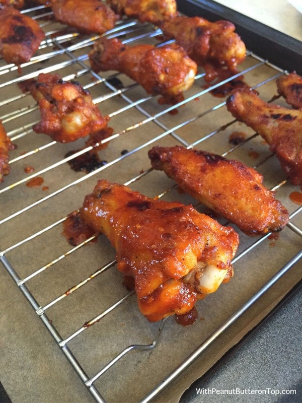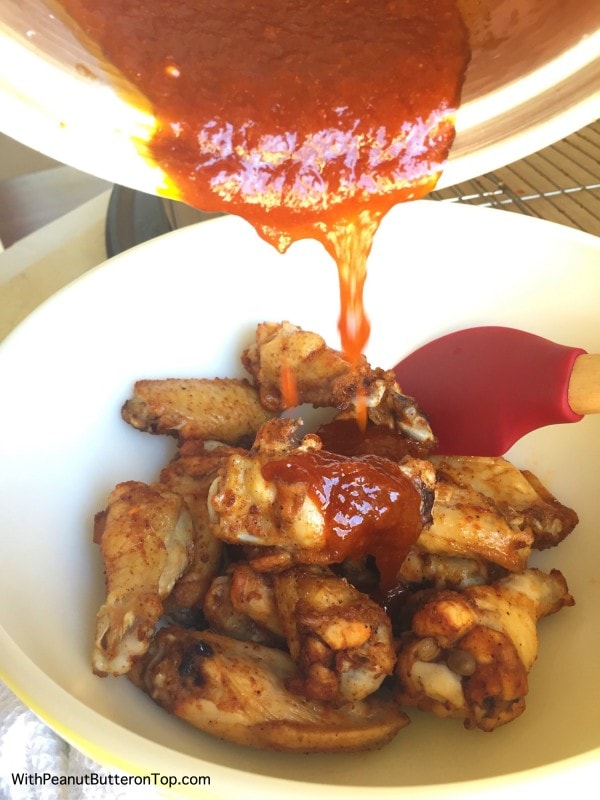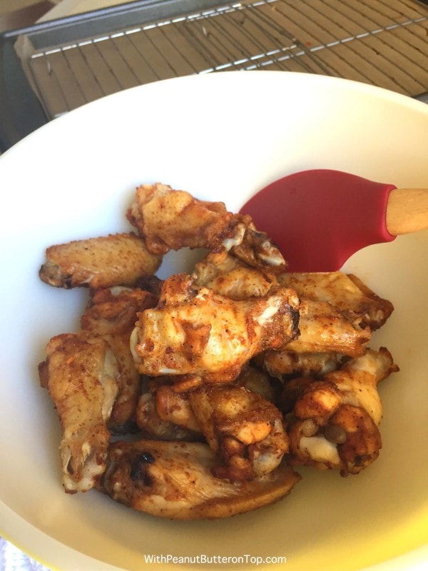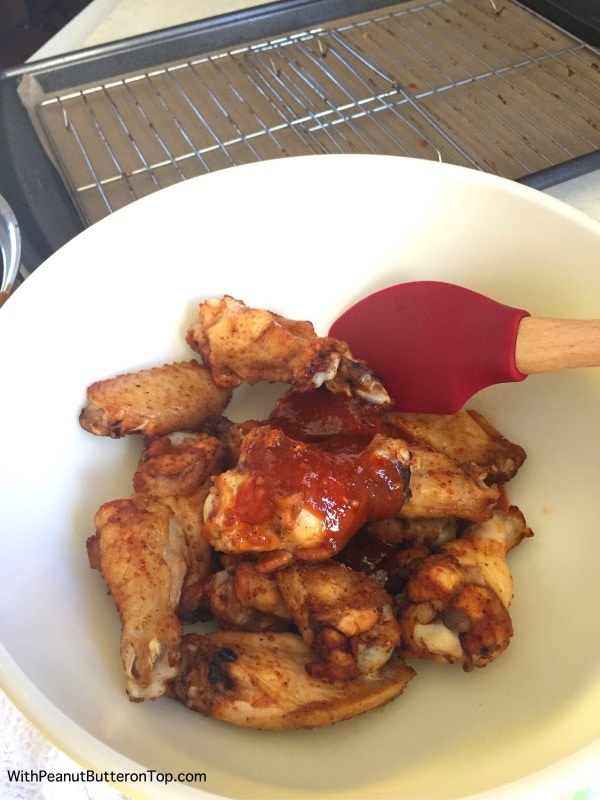- Once the wings are done, remove from oven and place them into a large bowl. Pour the sauce over the top and toss the wings to coat.